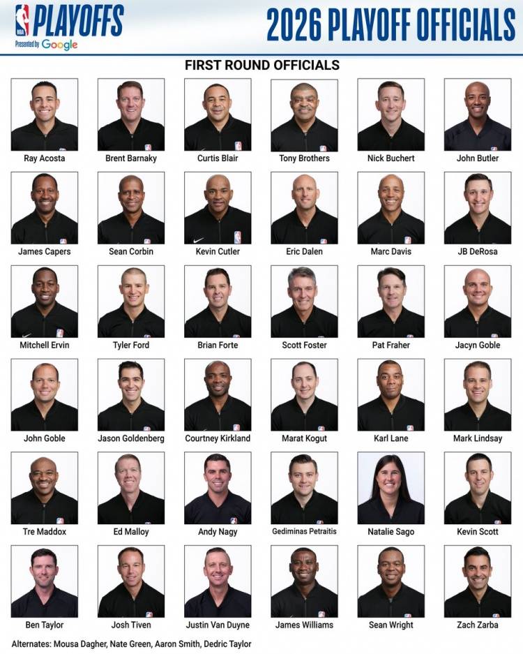 NBA季后赛首轮裁判大名单:福斯特领衔 1名女裁判入选 byadmin 发表于2026年04月14日 北京时间4月14日,NBA官方公布了本赛季附加赛和季后赛首轮的36人裁判大名单,福斯特、托尼兄弟等悉数在列。另外,Natalie Sago是本次唯一入选的一位女裁判,她也成为NBA历史上第三位执法季后赛的女裁判。 你可能感兴趣的内容 上一篇文章 德甲冠军稳了?拜仁提前4轮卫冕的悬念与记录 发表于2026年04月14日 byadmin 查看文章 下一篇文章 亚马尔请神!用历史第一人詹姆斯做头像!希望巴萨大逆转! 发表于2026年04月14日 byadmin 查看文章 你可能会喜欢